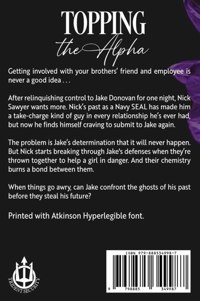 "A delicious mix of domination, submission, and suspense." ~ NY Times and USA Today Bestselling Author Nicole EdwardsGetting involved with your brothers' friend and employee is never a good idea...After relinquishing control to Jake Donovan for one night, Nick Sawyer wants more. Nick's past as a Navy SEAL has made him a take-charge kind of guy in every relationship he's ever had, but now he finds himself craving to submit to Jake again.The problem is Jake's determination that it will never happen. But Nick starts breaking through Jake's defenses when they're thrown together to help a girl in danger. And their chemistry burns a bond between them.When things go awry, can Jake confront the ghosts of his past before they steal his future?The Trident Security series contains D/s relationships, passionate romance, nail-biting suspense, and happily-ever-afters. This title contains an MM Romance between a Dom and his submissive that heats up the pages. The series is best read in order.