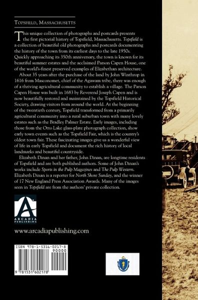 This unique collection of photographs and postcards presents the first pictorial history of Topsfield, Massachusetts. Topsfield is a collection of beautiful old photographs and postcards documenting the history of the town from its earliest days to the late 1950s. Quickly approaching its 350th anniversary, the town is known for its beautiful summer estates and the acclaimed Parson Capen House, one of the world's-finest preserved examples of Elizabethan architecture. About 35 years after the purchase of the land by John Winthrop in 1616 from Masconomet, chief of the Agawam tribe, there was enough of a thriving agricultural community to establish a village. The Parson Capen House was built in 1683 by Reverend Joseph Capen and is now beautifully restored and maintained by the Topsfield Historical Society, drawing visitors from around the world. At the beginning of the twentieth century, Topsfield transformed from a primarily agricultural community into a rural suburban town with many lovely estates such as the Bradley Palmer Estate. Early images, including those from the Otto Lake glass-plate photograph collection, show early town events such as the Topsfield Fair, which is the country's oldest town fair. These fascinating images give us a wonderful view of life in early Topsfield and document the rich history of local landmarks and beautiful countryside.