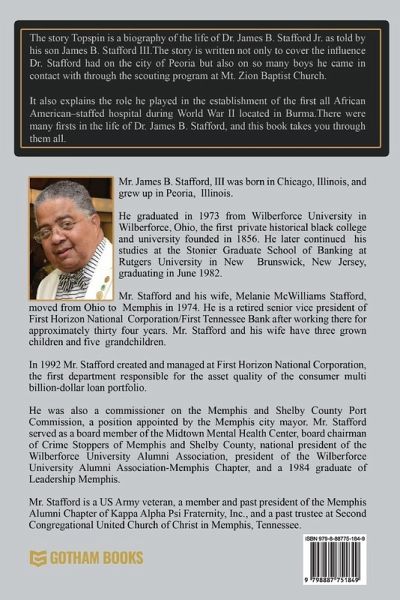 The story Topspin is a biography of the life of Dr. James B. Stafford, Jr. as told by his son James B. Stafford, III. The story is written not only to cover the influence Dr. Stafford had on the city of Peoria but also on so many boys he came in contact with through the scouting program at Mt. Zion Baptist Church. It also explains the role he played in the establishment of the first all African American-staffed hospital during World War II located in Burma. There were many firsts in the life of Dr. James B. Stafford, and this book takes you through them all.