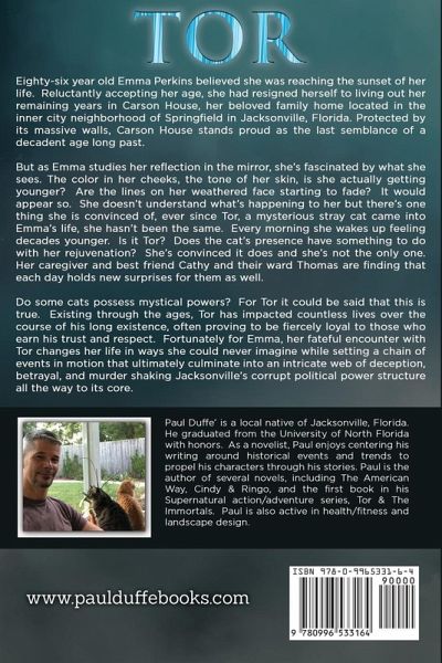 Eighty-six year old Emma Perkins believed she was reaching the sunset of her life. Reluctantly accepting her age, she had resigned herself to living out her remaining years in Carson House, her beloved family home located in the inner city neighborhood of Springfield in Jacksonville, Florida. Protected by its massive walls, Carson House stands proud as the last semblance of a decadent age long past. But as Emma studies her reflection in the mirror, she's fascinated by what she sees. The color in her cheeks, the tone of her skin, is she actually getting younger? Are the lines on her weathered face starting to fade? It would appear so. She doesn't understand what's happening to her but there's one thing she is convinced of, ever since Tor, a mysterious stray cat came into Emma's life, she hasn't been the same. Every morning she wakes up feeling decades younger. Is it Tor? Does the cat's presence have something to do with her rejuvenation? She's convinced it does and she's not the only one. Her caregiver and best friend Cathy and their ward Thomas are finding that each day holds new surprises for them as well. Do some cats possess mystical powers? For Tor it could be said that this is true. Existing through the ages, Tor has impacted countless lives over the course of his long existence, often proving to be fiercely loyal to those who earn his trust and respect. Fortunately for Emma, her fateful encounter with Tor changes her life in ways she could never imagine while setting a chain of events in motion that ultimately culminate into an intricate web of deception, betrayal, and murder shaking Jacksonville's corrupt political power structure all the way to its core.
