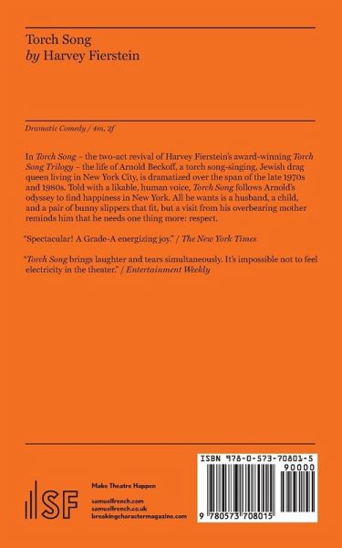 In Torch Song - the two-act revival of Harvey Fierstein's award-winning Torch Song Trilogy - the life of Arnold Beckoff, a torch song-singing, Jewish drag queen living in New York City, is dramatized over the span of the late 1970s and 1980s. Told with a likable, human voice, Torch Song follows Arnold's odyssey to find happiness in New York. All he wants is a husband, a child, and a pair of bunny slippers that fit, but a visit from his overbearing mother reminds him that he needs one thing more: respect.