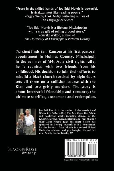 "Joe Edd Morris has honed a bullet aimed directly at the heart and soul of the reader." –Peggy Webb, USA Today bestselling author of The Language of Silence "Torched is a gripping novel of forbidden love, and friendship across racial divides." –IndieReader Approved Torched finds Sam Ransom at his first pastoral appointment in Holmes County, Mississippi, in the summer of ’64. At a civil rights rally, he is reunited with two friends from his childhood. His decision to join their efforts to rebuild a black church torched by nightriders sets all three on a collision course with the Klan and two grisly murders. The story is about interracial friendship and romance, the ultimate sacrifice, atonement and redemption.