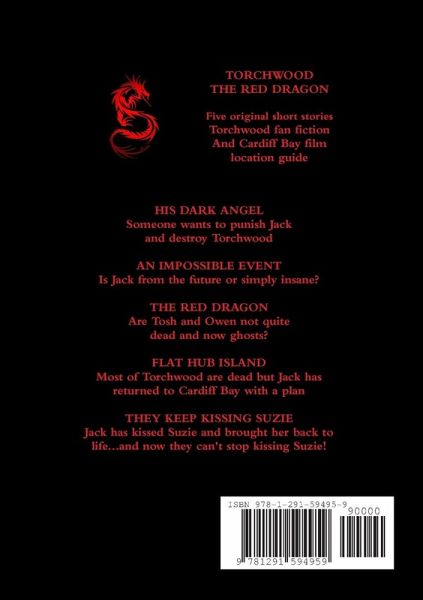 Five original Torchwood fan fiction short stories. HIS DARK ANGEL: Someone is trying to punish Jack and destroy Torchwood. Eventually recognizing the assassin Jack has to make a choice. Is Jack a good or evil man? AN IMPOSSIBLE EVENT: Is Jack really from the future or simply insane? The Torchwood Institute Asylum has the answer. THE RED DRAGON: Are Tosh and Owen not quite dead and really ghosts? A romantic story with a difference! FLAT HUB ISLAND: Most of Torchwood are dead but Jack has returned to Cardiff Bay with a plan. This is the short story which resulted in the novel 'The Dark Dragon'. THEY KEEP KISSING SUZIE: Jack has kissed Suzie and brought her back to life..and now they can't stop kissing Suzie! A very humorous retelling of 'They keep killing Suzie'. Book also includes a guide for visiting Cardiff Bay.
