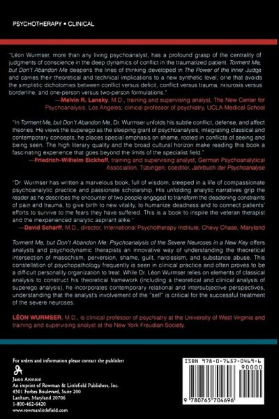 Torment Me, But Don't Abandon Me: Psychoanalysis of the Severe Neuroses in a New Key offers analysts and psychodynamic therapists an innovative way of understanding the theoretical intersection of masochism, perversion, shame, guilt, narcissism substance abuse. This constellation of psychopathology frequently is seen in clinical practice and often proves to be a difficult personality organization to treat. While Dr. Wurmser relies on elements of classical analysis to construct his theoretical framework (including a theoretical and clinical analysis of super ego analysis), he incorporates contemporary relational and intersubjective perspectives understanding that the analyst's involvement of the 'self' is critical for the successful treatment of the serious neuroses.