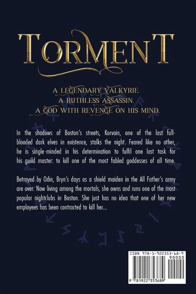 A legendary Valkyrie. A ruthless assassin. A forgotten god with revenge on his mind. In the shadows of Boston's streets, Korvain, one of the last full-blooded dark elves in existence, stalks the night. Feared like no other, he is single-minded in his determination to fulfill one last task for his guild master: to kill one of the most fabled goddesses of all time. Betrayed by Odin, Bryn's days as a shield maiden in the All Father's army are over. Now living among the mortals, she owns and runs one of the most popular nightclubs in Boston. She just has no idea that one of her new employees has been contracted to kill her... Torment is a dark gritty urban fantasy. This is a violent tale of revenge and regrets featuring a ruthless assassin and a strong-willed heroine. Suitable for 18+ readers, it's the first book in the Gods & Monsters trilogy. Perfect for fans of J.R. Ward, Gena Showalter, Kelly St. Clare, and Laurell K. Hamilton!