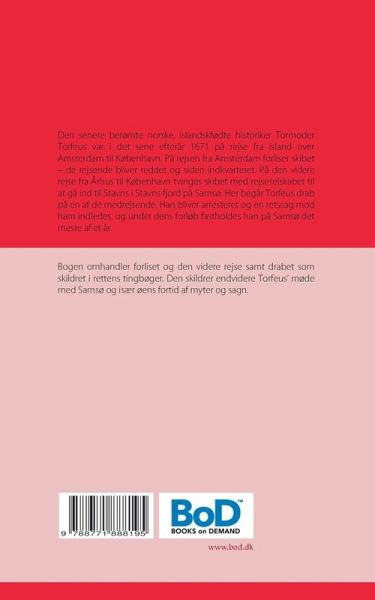 Den senere berømte norske, islandskfødte historiker Tormoder Torfeus var i det sene efterår 1671 på rejse fra Island over Amsterdam til København. På rejsen fra Amsterdam forliser skibet - de rejsende bliver reddet og siden indkvarteret. På den videre rejse fra Århus til København tvinges skibet med rejseselskabet til at gå ind til Stavns i Stavns fjord på Samsø. Her begår Torfeus drab på en af de medrejsende. Han bliver arresteret og en retssag mod ham indledes, og under dens forløb fastholdes han på Samsø det meste af et år. Bogen omhandler forliset og den videre rejse samt drabet som skildret i rettens tingbøger. Den skildrer endvidere Torfeus' møde med Samsø og især øens fortid af myter og sagn.