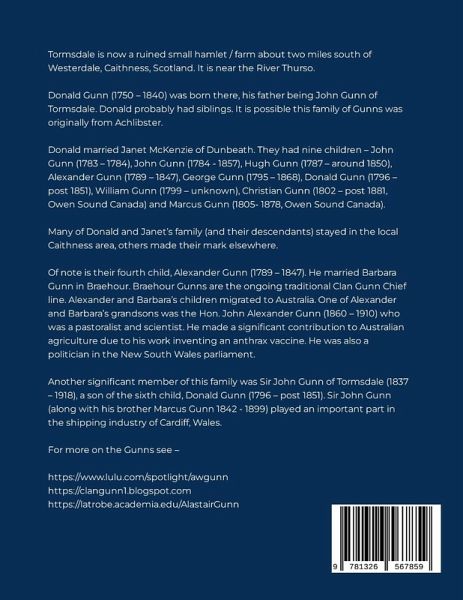 Tormsdale is now a ruined small hamlet / farm about two miles south of Westerdale, Caithness, Scotland. It is on the banks of the River Thurso. Donald Gunn (1750 - 1840) was born there, his father being John Gunn of Tormsdale. Donald probably had siblings. It is possible this family of Gunns was originally from Achlibster. Donald married Janet McKenzie of Dunbeath. They had nine children - John Gunn (1783 - 1784), John Gunn (1784 - 1857), Hugh Gunn (1787 - around 1850), Alexander Gunn (1789 - 1847), George Gunn (1795 - 1868), Donald Gunn (1796 - post 1851), William Gunn (1799 - unknown), Christian Gunn (1802 - post 1881, Owen Sound Canada) and Marcus Gunn (1805- 1878, Owen Sound Canada). Many of Donald and Janet's family (and their descendants) stayed in the local Caithness area, others made their mark elsewhere. Of note is their fourth child, Alexander Gunn (1789 - 1847). He married Barbara Gunn in Braehour. Braehour Gunns are the ongoing traditional Clan Gunn Chief line. Alexander and Barbara's children migrated to Australia. One of Alexander and Barbara's grandsons was the Hon. John Alexander Gunn (1860 - 1910) who was a pastoralist and scientist. He made a significant contribution to Australian agriculture due to his work inventing an anthrax vaccine. He was also a politician in the New South Wales parliament. Another significant member of this family was Sir John Gunn of Tormsdale (1837 - 1918), a son of the sixth child, Donald Gunn (1796 - post 1851). Sir John Gunn (along with his brother Marcus Gunn 1842 - 1899) played an important part in the shipping industry of Cardiff, Wales. For more on the Gunns see - https://www.lulu.com/spotlight/awgunn https://clangunn1.blogspot.com/ https://latrobe.academia.edu/AlastairGunn