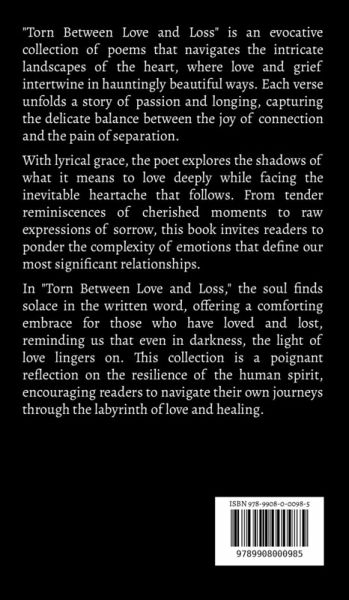 "Torn Between Love and Loss" is an evocative collection of poems that navigates the intricate landscapes of the heart, where love and grief intertwine in hauntingly beautiful ways. Each verse unfolds a story of passion and longing, capturing the delicate balance between the joy of connection and the pain of separation. With lyrical grace, the poet explores the shadows of what it means to love deeply while facing the inevitable heartache that follows. From tender reminiscences of cherished moments to raw expressions of sorrow, this book invites readers to ponder the complexity of emotions that define our most significant relationships. In "Torn Between Love and Loss," the soul finds solace in the written word, offering a comforting embrace for those who have loved and lost, reminding us that even in darkness, the light of love lingers on. This collection is a poignant reflection on the resilience of the human spirit, encouraging readers to navigate their own journeys through the labyrinth of love and healing.