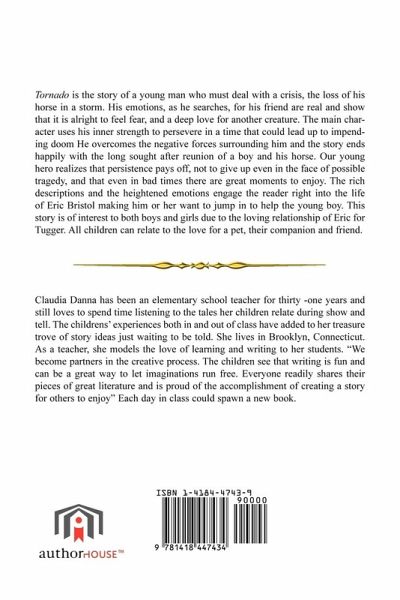 Tornado is the story of a young man who must deal with a crisis, the loss of his horse in a storm. His emotions, as he searches, for his friend are real and show that it is alright to feel fear, and a deep love for another creature. The main character uses his inner strength to persevere in a time that could lead up to impending doom He overcomes the negative forces surrounding him and the story ends happily with the long sought after reunion of a boy and his horse. Our young hero realizes that persistence pays off, not to give up even in the face of possible tragedy, and that even in bad times there are great moments to enjoy. The rich descriptions and the heightened emotions engage the reader right into the life of Eric Bristol making him or her want to jump in to help the young boy. This story is of interest to both boys and girls due to the loving relationship of Eric for Tugger. All children can relate to the love for a pet, their companion and friend.