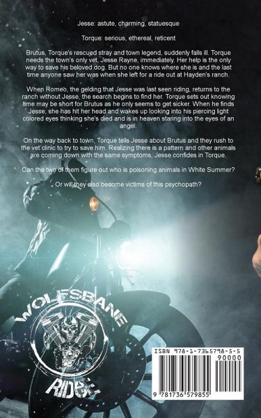 Jesse: astute, charming, statuesque Torque: serious, ethereal, reticent Horse's at Wolf's Landing start coming up sick after the new town vet arrives. Wanting to find out the cause, Jesse Rayne goes out of her way to test everything she can hoping to never see another animal die in such a way. When Romeo, the gelding that Jesse was last seen riding, returns to the ranch without Jesse, Torque is extremely worried. He sets out immediately to look for her. When he finds Jesse, she has hit her head and wakes up looking into his piercing light colored eyes thinking she's died and is in heaven staring into the eyes of an angel. Realizing there is a pattern and other animals are starting to come down with the same symptoms all over town, Jesse and Torque work around the clock trying to catch the culprit. Can the two of them figure out who is poisoning animals in White Summer? Or will they also become victims of this psychopath?
