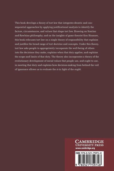 This book develops a theory of tort law that integrates deontic and consequential approaches by applying justificational analysis to identify the factors, circumstances, and values that shape tort law. Drawing on Kantian and Rawlsian philosophy, and on the insights of game theorist Ken Binmore, this book refocuses tort law on a single theory of responsibility that explains and justifies the broad range of tort doctrine and concepts. Under this theory, tort law asks people to appropriately incorporate the well-being of others into the decisions they make, explains when that duty applies, and explains the scope and limits of that duty. The theory also incorporates a theory of the evolutionary development of social values that people use, and ought to use, in meeting that duty and explains how decision-making from behind the veil of ignorance allows us to evaluate the is in light of the ought.