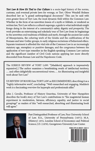 Tort Law & How It's Tied to Our Culture is a socio-legal history of the norms, customs, and eventual private laws for wrongs, or Tort. Oliver Wendell Holmes described law as "a grand anthropological document." This can be said with even greater force of Tort Law, the most dynamic field within the Common Law. Whether in the form of an unwritten lesson of a myth or folktale, or rendered as written law, Tort Law reflects a culture's superego, a guide to what individuals might forego doing in the interest of a community's safety, dignity and prosperity. The work provides an entertaining and scholarly tour of Tort Law from its beginnings in the unwritten oral traditions of folktale and myth, through the ancient law codes of Mesopotamia, the cohering work of the Greeks, and the codifications of the Romans and later Gothic groups, to early religious recitations of behavioral ethics. Separate treatment is afforded the vital role of the Common Law in an increasingly statutory age, exemplary or punitive damages and the congruence between the application of tort-type remedies in the English-speaking Common Law nations and the significant number of Civil Code nations applying law more directly descended from Roman Law and the Napoleonic Code.