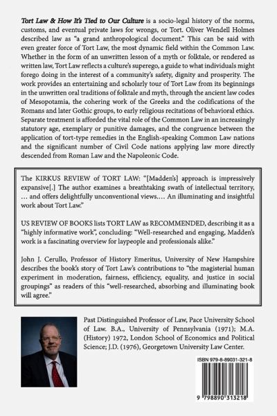 Tort Law & How It's Tied to Our Culture is a socio-legal history of the norms, customs, and eventual private laws for wrongs, or Tort. Oliver Wendell Holmes described law as "a grand anthropological document." This can be said with even greater force of Tort Law, the most dynamic field within the Common Law. Whether in the form of an unwritten lesson of a myth or folktale, or rendered as written law, Tort Law reflects a culture's superego, a guide to what individuals might forego doing in the interest of a community's safety, dignity and prosperity. The work provides an entertaining and scholarly tour of Tort Law from its beginnings in the unwritten oral traditions of folktale and myth, through the ancient law codes of Mesopotamia, the cohering work of the Greeks, and the codifications of the Romans and later Gothic groups, to early religious recitations of behavioral ethics. Separate treatment is afforded the vital role of the Common Law in an increasingly statutory age, exemplary or punitive damages and the congruence between the application of tort-type remedies in the English-speaking Common Law nations and the significant number of Civil Code nations applying law more directly descended from Roman Law and the Napoleonic Code.