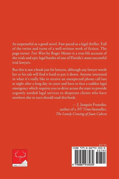 As suspenseful as a good novel. Fast-paced as a legal thriller. Full of the twists and turns of a well-written work of fiction. The page-turner Tort Wars by Roger Messer is a true-life account of the trials and epic legal battles of one of Florida's most successful trial lawyers. But this is not a book just for lawyers, although any lawyer worth her or his salt will find it hard to put it down. Anyone interested in what it's really like to receive an unexpected phone call late at night after a long day in court and have to face a sudden legal emergency which requires you to drive across the state to provide urgently needed legal services to desperate clients who have nowhere else to turn should read this book. --J. Joaquin Fraxedas, author of a NY Times bestseller, The Lonely Crossing of Juan Cabera