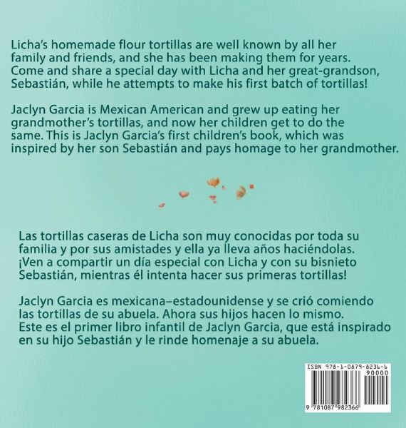 Licha's homemade flour tortillas are well known by all her family and friends, and she has been making them for years. Eating homemade tortillas with mantequilla, or butter, is a tradition in Sebastián's family. Sebastián is Licha's great-grandson, and he gets to learn how to make perfect circle shaped tortillas, just like Licha! There will be some challenges along the way for Sebastián, but Licha teaches him the importance of practice and patience. Sebastián is determined to make the tortillas just like Licha and will not give up until he does so. Come and share a special day with Licha and her great-grandson, Sebastián, while he attempts to make his first batch of tortillas! Jaclyn Garcia is Mexican American and grew up eating her grandmother's homemade tortillas, and now her children get to do the same. This is Jaclyn Garcia's first children's book, which was inspired by her son Sebastián and pays homage to her grandmother. It was very important to Jaclyn to create a bilingual book in Spanish and English for the Latino community. Many families nowadays are raising bilingual children and this book will continue to encourage that. Her grandmother is currently 94 years old and still makes her famous homemade, flour tortillas.