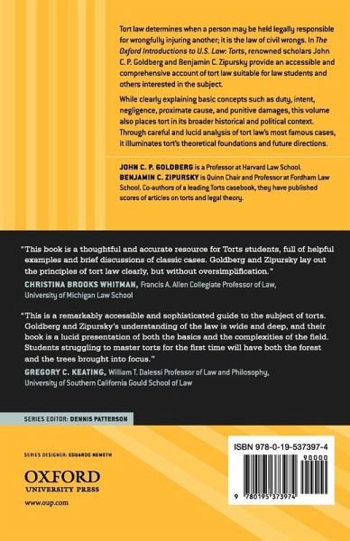 Torts--personal injury law--is a fundamental yet controversial part of our legal system. The Oxford Introductions to U.S. Law: Torts provides a clear and comprehensive account of what tort law is, how it works, what it stands to accomplish, and why it is now much-disputed. Goldberg and Zipursky--two of the world's most prominent tort scholars--carefully analyze leading judicial decisions and prominent tort-related legislation, and place each event into its proper context. Topics covered include products liability, negligence, medical malpractice, intentional torts, defamation and privacy torts, punitive damages, and tort reform.