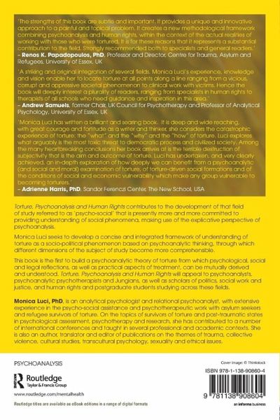 Once a sufficiently coherent understanding has been reached, Luci proposes using it as a groundwork tool in the human rights field to re-think the best strategies of prevention and recovery from post-torture psychological and social suffering. The book initiates a dialogue between psychoanalysis and human rights, showing that the proposed psychoanalytic understanding is a viable conceptualisation for expanding thinking of crucial issues regarding torture, which might be relevant to human rights and legal doctrine, such as the responsibility of perpetrators, the reparation of victims and the question of 'truth'.