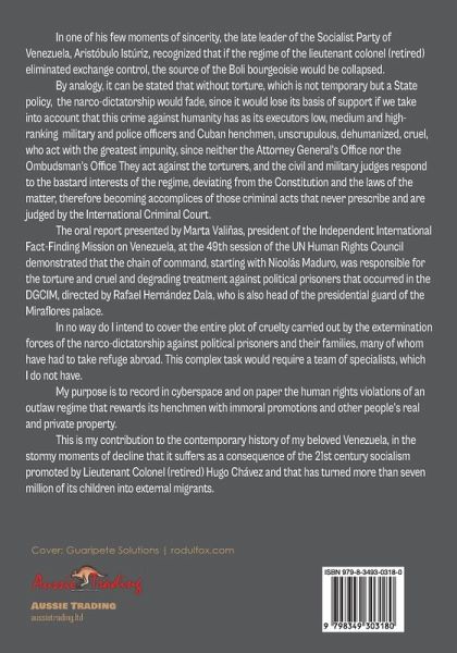 In one of his few moments of sincerity, the late leader of the Socialist Party of Venezuela, Aristóbulo Istúriz, recognized that if the regime of the lieutenant colonel (retired) eliminated exchange control, the source of the Boli bourgeoisie would be collapsed. By analogy, it can be stated that without torture, which is not temporary but a State policy, the narco-dictatorship would fade, since it would lose its basis of support if we take into account that this crime against humanity has as its executors low, medium and high-ranking military and police officers and Cuban henchmen, unscrupulous, dehumanized, cruel, who act with the greatest impunity, since neither the Attorney General's Office nor the Ombudsman's Office They act against the torturers, and the civil and military judges respond to the bastard interests of the regime, deviating from the Constitution and the laws of the matter, therefore becoming accomplices of those criminal acts that never prescribe and are judged by the International Criminal Court. The oral report presented by Marta Valiñas, president of the Independent International Fact-Finding Mission on Venezuela, at the 49th session of the UN Human Rights Council demonstrated that the chain of command, starting with Nicolás Maduro, was responsible for the torture and cruel and degrading treatment against political prisoners that occurred in the DGCIM, directed by Rafael Hernández Dala, who is also head of the presidential guard of the Miraflores palace. In no way do I intend to cover the entire plot of cruelty carried out by the extermination forces of the narco-dictatorship against political prisoners and their families, many of whom have had to take refuge abroad. This complex task would require a team of specialists, which I do not have. My purpose is to record in cyberspace and on paper the human rights violations of an outlaw regime that rewards its henchmen with immoral promotions and other people's real and private property. This is my contribution to the contemporary history of my beloved Venezuela, in the stormy moments of decline that it suffers as a consequence of the 21st century socialism promoted by Lieutenant Colonel (retired) Hugo Chávez and that has turned more than seven million of its children into external migrants.