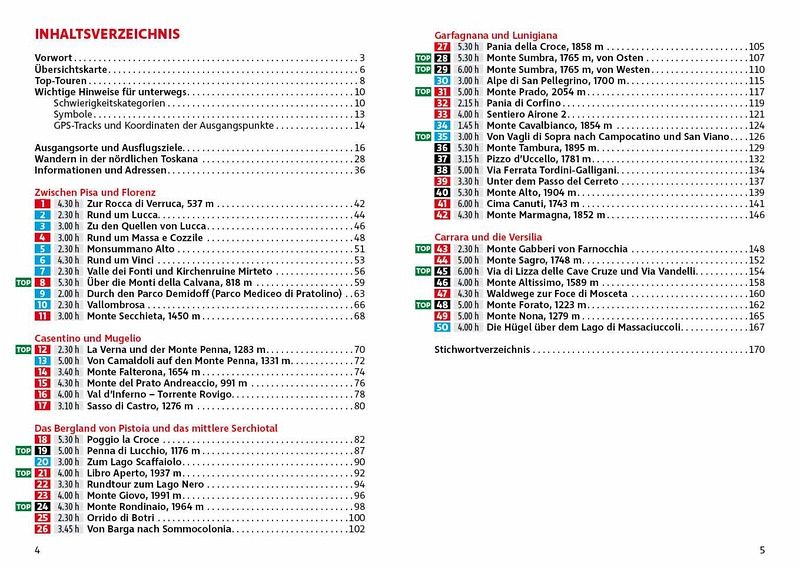 Rund um Florenz und Pisa führen Wanderwege durch prachtvolle toskanische Gartenlandschaften, während die Apuanische Riviera bei Massa und Carrara Hochgebirgserlebnisse und Badefreuden kombiniert. Das kaum bekannte Hinterland von Lucca begeistert mit einsamen Pfaden, uralten Dörfern, faszinierenden Höhlen und stillen Seen - ein echtes Wandergeheimnis mit knackigen Klettersteigen.