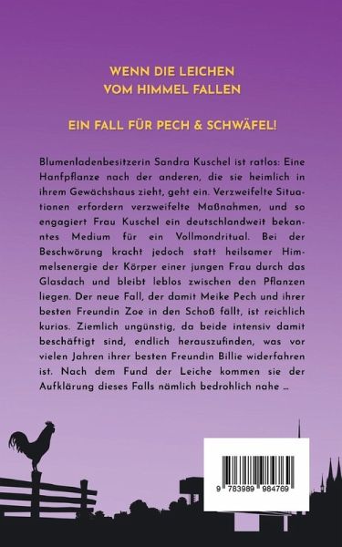 Wenn die Leichen vom Himmel fallen – Ein Fall für Pech & Schwäfel! Der bisher verrückteste Fall in der Cosy Crime-Reihe nach dem Audible Original jetzt auch als E-Book Blumenladenbesitzerin Sandra Kuschel ist ratlos: Eine Hanfpflanze nach der anderen, die sie heimlich in ihrem Gewächshaus zieht, geht ein. Verzweifelte Situationen erfordern verzweifelte Maßnahmen, und so engagiert Frau Kuschel ein deutschlandweit bekanntes Medium für ein Vollmondritual. Bei der Beschwörung kracht jedoch statt heilsamer Himmelsenergie der Körper einer jungen Frau durch das Glasdach und bleibt leblos zwischen den Pflanzen liegen. Der neue Fall, der damit Meike Pech und ihrer besten Freundin Zoe in den Schoß fällt, ist reichlich kurios. Ziemlich ungünstig, da beide intensiv damit beschäftigt sind, endlich herauszufinden, was vor vielen Jahren ihrer besten Freundin Billie widerfahren ist. Nach dem Fund der Leiche kommen sie der Aufklärung dieses Falls nämlich bedrohlich nahe … Weitere Titel in der Reihe Die Tote in der Wand (ISBN: 9783987780820) Der tote Berliner (ISBN: 9783987780844) Der Tote im Sand (ISBN: 9783987780851) Tot im Wald (ISBN: 9783987786990) Tot im Pool (ISBN: 9783987787003) Tot im Eis (ISBN: 9783987787171) Erste Leser:innenstimmen „Dieser humorvolle Roman bietet alles, was ein guter Cozy Crime braucht: eine charmante Hauptfigur, eine geheimnisvolle Handlung und jede Menge Atmosphäre." „Meike Pech und ihre Freundin Zoe sind ein wunderbares Ermittlerduo, das mit viel Herz und Humor den Rätseln auf den Grund geht." „Humorvoll und fesselnd!" „Der Cosy Krimi entwickelt sich schnell zu einem spannenden Kriminalfall, der bis zum Schluss fesselt."