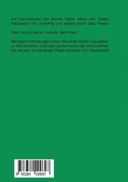 Dieses Buch ist eine Sammlung humorvoller Gedichte über den "Tod" und über das "Alt-Sein". Das Wissen um die eigene Endlichkeit macht den Tod zu unserem ständigen Begleiter.im Leben. Daran kann man natürlich nichts ändern. Doch sollten wir uns davon nicht die 'Petersilie verhageln' lassen und ihm lieber mit einer guten Portion Fatalismus, Spaß und besonders mit viel Humor, gern auch mit schwarzem Humor, begegnen!Auch das Altern und das Alt-Sein muss uns nicht die Laune und den Spaß am Leben nehmen, wie die 'Greise' uns in den skurrilen Geschichten und Erlebnissen der zeigen.