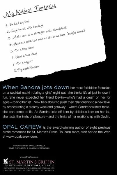 Opal Carew's Total Abandon is a delectable new erotic romance about a woman who gets a once-in-a-lifetime opportunity to live out her most sinful fantasies. When Sandra jots her most forbidden fantasies on a cocktail napkin during a girl's night out, she thinks it's all just innocent fun. She never expected her friend Devlin-who's had a crush on her for ages-to find her list. Now, he's about to push their relationship to a new level by orchestrating a steamy weekend getaway... where Sandra's wildest fantasies can come to life. As Sandra ticks off item by delicious item on her list, she tests the limits of pleasure-and the limits of her relationship with Devlin...