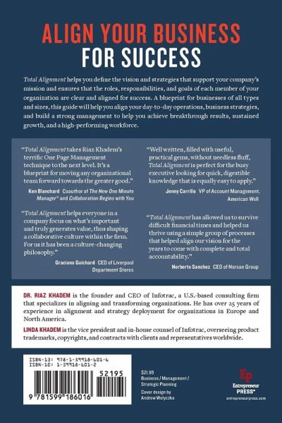 DR. RIAZ KHADEM is the founder and CEO of Infotrac, a U.S.-based consulting firm that specializes in aligning and transforming organizations.Having spent over 25 years of consulting managers in business strategy deployment, performance management, leadership, and cultural transformation, Dr. Khadem grew inspired to create the Total Alignment management model. Khadem's work in business strategy provides managers across the globe a succinct model that joins unique concepts, methodologies, and tools together to align their organizations at all levels and transform the way managers work. This model has since been implemented in organizations across the globe, including U.S., UK, Germany, Spain, Austria, Mexico, Colombia, and Brazil along with several industries such as manufacturing, insurance, and retail. Dr. Khadem has lectured in business forums in several countries. He has held teaching and research positions at Southampton University, Northwestern University, and Universite Laval, and currently holds a doctorate in Applied Mathematics. LINDA KHADEM is the vice president and in-house counsel of Infotrac, overseeing product trademarks, copyrights, and contracts with clients and representatives worldwide. In addition, she has been instrumental in the evolution of Total Alignment, along with other business strategy books such as One Page Management and previous adaptations of Total Alignment published in Colombia and Brazil. Along with her work at Infotrac, Khadem pursues justice and education across the nation. She has served as secretary and chairperson of the Baha'I Justice Society, a national organization of 180 attorneys. She has spoken at numerous conferences on the theme of justice and served as the coordinator of refugee children's classes promoting moral and spiritual education in eleven Atlanta neighborhoods. She holds a Bachelor's degree in Sociology from the University of Illinois as well as a degree of Juris Doctor (J.D.) from Emory University and has been educated in the U.S., UK, and Canada.