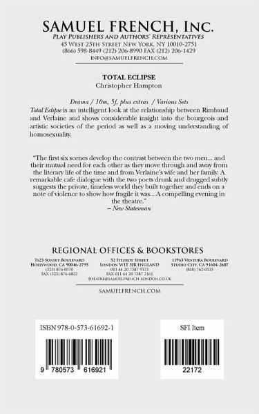 Christopher Hampton Drama Characters: 10 male, 5 female, plus extras Various Sets Revised version. Total Eclipse is an intelligent look at the relationship between Rimbaud and Verlaine and shows considerable insight into the bourgeois and artistic societies of the period as well as a moving understanding of homosexuality. "The first six scenes develop the contrast between the two men...and their mutual need for each other as they move th