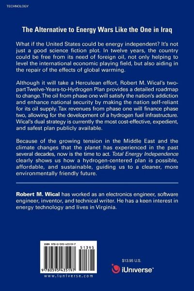 The Alternative to Energy Wars Like the One in Iraq What if the United States could be energy independent? It's not just a good science fiction plot. In twelve years, the country could be free from its need of foreign oil, not only helping to level the international economic playing field, but also aiding in the repair of the effects of global warming. Although it will take a Herculean effort, Bob Wical's two-part Twelve-Years-to-Hydrogen Plan provides a detailed roadmap to change. The oil from phase one will satisfy the nation's addiction and enhance national security by making the nation self-reliant for its oil supply. Tax revenues from phase one will finance phase two, allowing for the development of a hydrogen fuel infrastructure. Wical's dual strategy is currently the most cost-effective, expedient, and safest plan publicly available. Because of the growing tension in the Middle East and the climate changes that the planet has experienced in the past several decades, now is the time to act. Total Energy Independence clearly shows us how a hydrogen-centered plan is possible, affordable, and sustainable, guiding us to a cleaner, more environmentally friendly future.