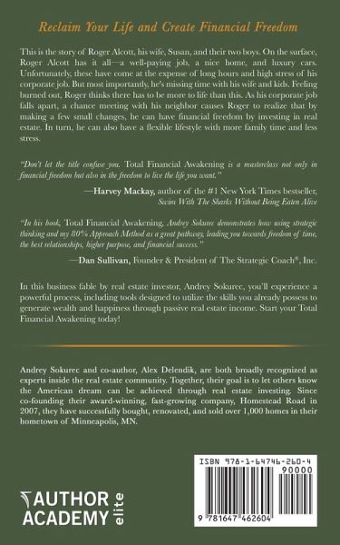 This is the story of Roger Alcott, his wife, Susan, and their two boys. On the surface, Roger Alcott has it all-a well-paying job, a nice home, and luxury cars. Unfortunately, these have come at the expense of long hours and high stress of his corporate job. But most importantly, he's missing time with his wife and kids. Feeling burned out, Roger thinks there has to be more to life than this. As his corporate job falls apart, a chance meeting with his neighbor causes Roger to realize that by making a few small changes, he can have financial freedom by investing in real estate. In turn, he can also have a flexible lifestyle with more family time and less stress. In this business fable by real estate investor, Andrey Sokurec, you'll experience a powerful process, including tools designed to utilize the skills you already possess to generate wealth and happiness through passive real estate income. Start your Total Financial Awakening today.