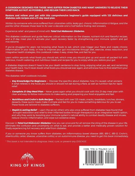 A cookbook designed for those who suffer from diabetes and want answers to relieve their symptoms as fast as possible, and regain their lives back. Restore and relieve your gut with this comprehensive beginner's guide equipped with 125 delicious and diabetes-safe recipes and a 21-day meal plan. Written by someone who once suffered from ulcerative colitis, leaky gut, chronic inflammation & fatigue, and the painful other illnesses those lead to for over a decade and a half before finding real answers. Experience relief and peace of mind with Total Gut Makeover: Diabetes. This diabetes cookbook and guide features critical information on the disease, nutrient-rich and flavorful recipes, and a 21-day meal plan to activate your rapid recovery faster by strengthening your immune system and gut microbiome. If you've struggled for years not knowing what foods to eat, which ones trigger your flares and create chronic inflammation in your body, or how to improve your gut microbiome through diet, exercise, stress reduction, and integrative health strategies, this cookbook makes it easy, stress-free, and fast for you. Learn within seconds what foods you should eat, which ones you should give up and avoid-all packed full with delicious, mouth-watering, and nutritious meals and recipes for you to enjoy while you restore your gut. A diabetes diagnosis doesn't have to be your death sentence to stop living, enjoying what you eat, and reclaiming your health back. You'll never doubt what foods you should eat ever again, and will know how to find relief from your inflammatory bowel disease. This diabetes-relief cookbook includes: Key Knowledge For Beginners - Discover the specifics about diabetes, how it's caused, what worsens it, what relieves it, the foods you should or should not eat during a flare, as well as nutrition tips for rapid relief. Complete 21-Day Meal Plan - Never guess again what you should cook with this 21-day meal plan with clear and easy-to-follow instructions to make eating and preparing your food enjoyable and fast. Nutritious and Diabetes-Safe Recipes - Packed with over 125 meals, snacks, breakfasts, lunches, dinners, desserts, these quick meals make it simple and fast for you to make something delicious for you to eat. These foods are tailored to diabetes sufferers. Rapid & Lasting Relief - Learn the secret others who also once suffered from diabetes have found that brought restoration and relief to their inflamed bodies through therapeutics as an integrative health option, and why they work by boosting your immune system's natural ability to combat deadly disease and viruses, reduce chronic inflammation, and wipe out oxidative stress. Discover in Total Gut Makeover: Diabetes how you can once and for all remove the sting of the disease in your life, eliminate the confusion and uncertainty on what to eat, and provide a better and medically proven solution for finally experiencing full recovery and relief from diabetes. If you or someone you know suffers from diabetes, an inflammatory bowel disease (IBS, IBS-C, IBS-D, Crohn's, diverticulitis, celiac disease, ulcerative colitis), or an autoimmune disease, you need to get this book immediately. Scroll up and 1-Click Buy today. It's time you got your life back. Don't wait! * This book is not intended to diagnose, treat, cure, or prevent any disease.