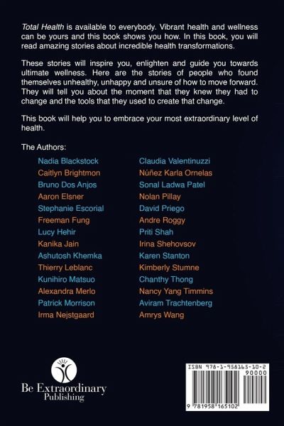 Are you ready to have total health and wellness? If so, this book is for you! Total Health for Extraordinary Living is filled with tips and techniques for living a healthy, happy lifestyle. With contributions from 30 coaches, peak performers, athletes and weekend warriors, you will find everything you need to live at peak health in this book. These are the stories of people who had amazing health transformations. They are sharing their stories to show you that it is never too late to move towards the expansive health and endless energy that is your natural state of being. Total Health For Extraordinary Living encourages you to look at your health holistically. This means that you are paying attention to your physical body by eating right and exercising but it also means taking care of your mental health as well as your spiritual side. Holistic health means body, mind and spirit are all working in unison. This book will cover many different aspects of health so that you can create a healthy lifestyle and ensure total health for your entire lifetime. You will learn:How to implement a simple exercise program for ultra fitness How to create a diet that nourishes you. How to use affirmations to improve your self image. How to use a simple exercise each morning to change your mindset. How running can become a meditation. How to add meditation to your schedule. How adding a gratitude practice can uplevel your life. How community can help you live the healthy lifestyle you imagine. Learn to make health an everyday part of your life. Learn how gratitude can change your life. You will learn how to take care of your physical body as well as to learn mindfulness techniques and health techniques that will help you live in peak health.