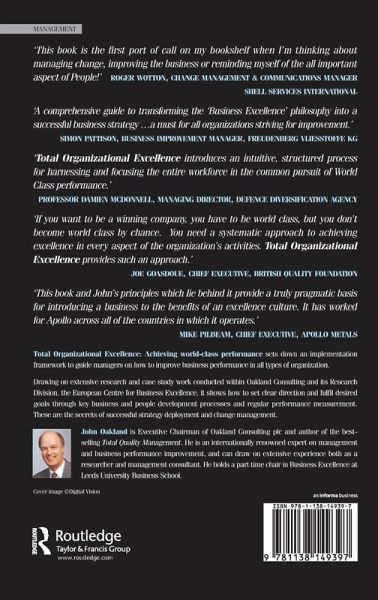 Total Organizational Excellence: Achieving world-class performance sets down an implementation framework to guide managers on how to improve business performance in all types of organization. Drawing on extensive research and case study work conducted within Oakland Consulting and its Research Division, the European Centre for Business Excellence, it shows how to set clear direction and fulfil desired goals through key business and people development processes and regular performance measurement. These are the secrets of successful strategy deployment and change management.