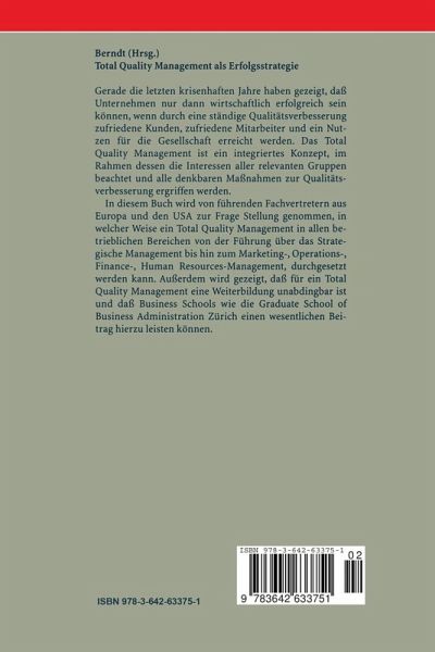 Erster Teil Führungs-Qualität und Total Quality Management.- Führungsauditierung als Erfolgsbeitrag zum Total Quality Management.- Total Quality Management und Management-Andragogik.- Strategieschöpfung in Militär und Unternehmung.- Managing Change: Strategic Response, Organizational Realities, and Overcoming Resistance.- Zweiter Teil Strategic Management und Total Quality Management.- Total Quality Management und Unternehmensstrategie.- Target Quality und Target Value Management: Ein Weg zum und nach dem Total Quality Management.- Wertkette, Schnittstellen-Management und Total Quality Management.- Beyond Downsizing: An American Perspective.- Dritter Teil Marketing-Management und Total Quality Management.- Total Quality und Marketing.- Steigerung des Markenwertes durch Total Quality Management.- Integrierte Kommunikation und Total Quality Management.- Marketing Research Efforts to Achieve Total Quality Management: Some Empirical Results.- Vierter Teil Operations-Management und Total Quality Management.- Proze?optimierung im Rahmen des Operations-Management.- Fünfter Teil Finanz-Management und Total Quality Management.- Ansatzpunkte zum Total Quality Management in der Kreditwirtschaft: Ein Überblick.- Total Quality Management in Banken.- Sechster Teil Controlling und Total Quality Management.- Von der Qualitätsstrategie zum Qualitätscontrolling.- Siebter Teil Human Resources Management und Total Quality Management.- Total Quality Management und Organisation der Personalentwicklung.- Personalmanagementsysteme und Total Quality Management - das Beispiel Hamburg-Mannheimer Versicherungsgesellschaften.
