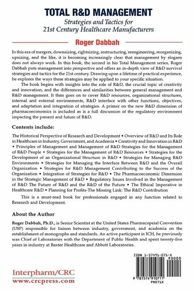 Drawing on a lifetime of experience, Roger Dobbah gives readers an in-depth view of R&D survival strategies and tactics and demonstrates how to apply them to any organization. The author provides insights into the role of R&D, the crucial topic of creativity and innovation, and the differences and similarities between general management and R&D management. He covers R&D resources, organizational structures, internal and external environments, R&D interface with other functions, objectives and adaptation, and integration of strategies. It includes coverage of the new R&D dimension of pharmacoeconomics and a full discussion of the regulatory environment impacting the present and future of R&D.