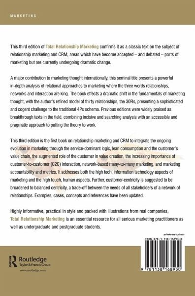 This third edition of Total Relationship Marketing confirms it as a classic text on the subject of relationship marketing and CRM, areas which have become accepted - and debated - parts of marketing but are currently undergoing dramatic change. A major contribution to marketing thought internationally, this seminal title presents a powerful in-depth analysis of relational approaches to marketing where the three words relationships, networks and interaction are king. The book effects a dramatic shift in the fundamentals of marketing thought, with the author's refined model of thirty relationships, the 30Rs, presenting a sophisticated and cogent challenge to the traditional 4Ps schema. Previous editions were widely praised as breakthrough texts in the field, combining incisive and searching analysis with an accessible and pragmatic approach to putting the theory to work. This third edition is the first book on relationship marketing and CRM to integrate the ongoing evolution in marketing through the service-dominant logic, lean consumption and the customer's value chain, the augmented role of the customer in value creation, the increasing importance of customer-to-customer (C2C) interaction, network-based many-to-many marketing, and marketing accountability and metrics. It addresses both the high tech, information technology aspects of marketing and the high touch, human aspects. Further, customer-centricity is suggested to be broadened to balanced centricity, a trade-off between the needs of all stakeholders of a network of relationships. Examples, cases, concepts and references have been updated. Highly informative, practical in style and packed with illustrations from real companies, Total Relationship Marketing is an essential resource for all serious marketing practitioners as well as undergraduate and postgraduate students.