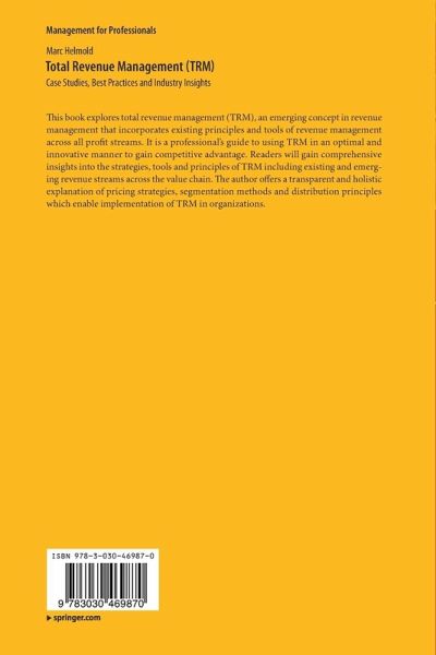 Chapter 1 Total Revenue Management (TRM).- Chapter 2 Pricing Elements and Price Elasticity.- Chapter 3 Pricing as Part of the Corporate Strategy.- Chapter 4 Pricing Strategies.- Chapter 5 Supply Chain Management and Distribution Channels.- Chapter 6 Value Drivers in Revenue Management.- Chapter 7 Audits as Tool to evaluate Value.- Chapter 8 TRM for Services.- Chapter 9 Creating the Value Proposition.- Chapter 10 TRM in companies with financial Difficulties.- Chapter 11 Pricing in the Automotive Industry.- Chapter 12 Pricing in the Hospitality Industry.- Chapter 13 Pricing in the Aviation Industry.- Chapter 14 Pricing in the Healthcare Sector.- Chapter 15 Pricing Strategy in the Beer Industry.- Chapter 16 Outlook: Full Revenue Management (FRM).- Glossary.- Index.