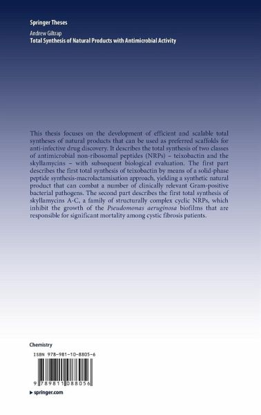 This thesis focuses on the development of efficient and scalable total syntheses of natural products that can be used as preferred scaffolds for anti-infective drug discovery. It describes the total synthesis of two classes of antimicrobial non-ribosomal peptides (NRPs) - teixobactin and the skyllamycins - with subsequent biological evaluation. The first part describes the first total synthesis of teixobactin by means of a solid-phase peptide synthesis-macrolactamisation approach, yielding a synthetic natural product that can combat a number of clinically relevant Gram-positive bacterial pathogens. The second part describes the first total synthesis of skyllamycins A-C, a family of structurally complex cyclic NRPs, which inhibit the growth of the Pseudomonas aeruginosa biofilms that are responsible for significant mortality among cystic fibrosis patients.