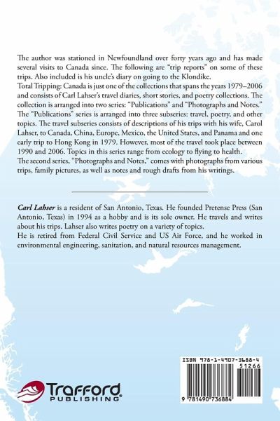 The author was stationed in Newfoundland over forty years ago and has made several visits to Canada since. The following are "trip reports" on some of these trips. Also included is his uncle's diary on going to the Klondike. Total Tripping: Canada is just one of the collections that spans the years 1979-2006 and consists of Carl Lahser's travel diaries, short stories, and poetry collections. The collection is arranged into two series: "Publications" and "Photographs and Notes." The "Publications" series is arranged into three subseries: travel, poetry, and other topics. The travel subseries consists of descriptions of his trips with his wife, Carol Lahser, to Canada, China, Europe, Mexico, the United States, and Panama and one early trip to Hong Kong in 1979. However, most of the travel took place between 1990 and 2006. Topics in this series range from ecology to flying to health. The second series, "Photographs and Notes," comes with photographs from various trips, family pictures, as well as notes and rough drafts from his writings.
