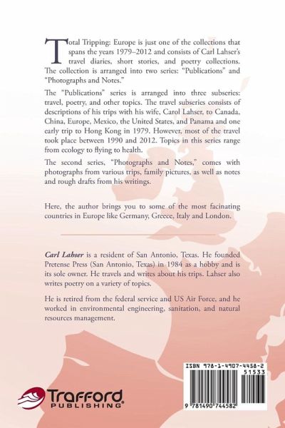 Total Tripping: Europe is just one of the collections that spans the years 1979-2006 and consists of Carl Lahser's travel diaries, short stories, and poetry collections. The collection is arranged into two series: "Publications" and "Photographs and Notes." The "Publications" series is arranged into three subseries: travel, poetry, and other topics. The travel subseries consists of descriptions of his trips with his wife, Carol Lahser, to Canada, China, Europe, Mexico, the United States, and Panama, and one early trip to Hong Kong in 1979. However, most of the travel took place between 1990 and 2006. Topics in this series range from ecology to flying to health. The second series, "Photographs and Notes," comes with photographs from various trips, family pictures, as well as notes and rough drafts from his writings. Here, the author brings you to some of the most fascinating countries in Europe, like Germany, Greece, Italy, and London.