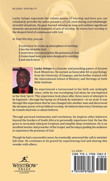 Lucky Selepe expounds the valiant power of worship and how you can voluntarily provoke the active presence of God, even during overwhelmingly stressful situations. He goes beyond worship in song and outlines significant elements and practical examples of acts of worship. He shows how worship is the deepest level of communion with God. In Total Worship, you can § Learn how to create an atmosphere of worship; § See the invisible God; § Learn how you can practice the presence of God; § Understand how you were designed to worship; § and much more.