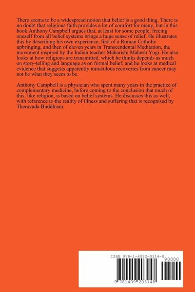 There seems to be a widespread notion that belief is, in itself, a good thing, but in this book Anthony Campbell argues that, for at least some people, freeing oneself from all belief systems brings a huge sense of relief. He illustrates this by describing his own experience of Roman Catholicism and Transcendental Meditation. He also looks at the evidence for miraculous cures for cancer and at ideas about the soul, with particular reference to survival. And he has a discussion of how religions are transmitted, which he thinks depends on story-telling and language as much as on formal belief. This is a wide-ranging book with a lot of ideas.