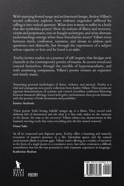 With stunning formal range and architectural design, Anders Villani's second collection explores how violence engenders selfhood by calling it into radical question. What does it mean to suffer in a body that also symbolises power? How can poetry, alert to the 'blur' and the 'panorama', trace this moral dissonance at its subtlest and most intimate? How do notions of illness and recovery, victim and perpetrator, rest on fraught archetypes, and what alternate understandings emerge when these foundations waver? Villani roves between myth, confession, narrative, and dream to address such questions-not abstractly, but through the experiences of a subject whose capacity to love and be loved is at stake. Novelistic in arc and scope, lyrically sensuous and searching, Totality invites readers on a journey of self-inquiry that dredges new channels in the contemporary poetics of trauma. As secrets reveal and conceal themselves, through the crucible of hypermasculinity, and with unstinting compassion, Villani's poems venture an expansive and timely music.