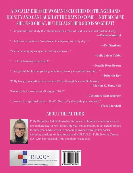 A TOTALLY DRESSED WOMAN IS CLOTHED IN STRENGTH AND DIGNITY AND CAN LAUGH AT THE DAYS TO COME - NOT BECAUSE SHE IS SO GREAT, BUT BECAUSE HER GOD IS SO GREAT! "...impactful bible study that illuminates the armor of God in a new and profound way...", Michelle Wenzel "...helps us to dress in a 'war-drove' to empower us every day...", Pat Stephens "She's encouraging us again in Totally Dressed...", Julie Joiner Tubbs "...a life-changing experience!", Natalie Rose Brown "...insightful, biblical unpacking to achieve victory in spiritual warfare...", Deborah Rey "Polly has given a gift to her sisters in Christ through her new Bible study...", Marion K. Tims, EdS "Great study for women in all stages of life!", Cassandra Schneeberger "...we are in a spiritual battle...Totally Dressed is the battle plan we need." Tracy Marshall