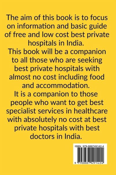 The aim of this book is to focus on information and basic guidelines for free and low-cost best private hospitals in India. The Indian public health sector encompasses 18% of total outpatient care and 44% of total inpatient care. Middle and upper-class individuals living in India tend to use public healthcare less than those with a lower standard of living. My aim is to provide information to the citizens in India about affordable health and wellness as well as specialist services through the best private hospitals free of cost or at low cost in India. In such a situation, my inquiry, the curiosity to know the unknown and raise awareness by combining the explanations of different scopes of health care with low cost and free of cost at best private hospitals will be successful by reading this book. This book will be a companion to all those who are seeking the best private hospitals at almost no cost including food and accommodation. This is my hope and I am confirmed about the fact that this book will help people to get the best specialist services in healthcare at absolutely no cost at the best private hospitals with the best doctors in India. So, I have enumerated here the top private hospitals of India with all the best medical facilities at free of cost or low cost, including food and accommodation.