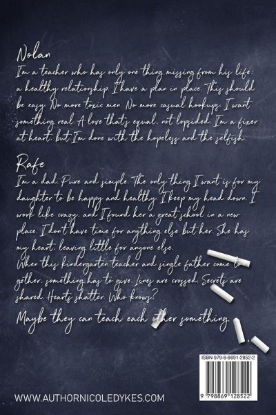 Nolan I'm a teacher who has only one thing missing from his life: a healthy relationship. I have a plan in place. This should be easy. No more toxic men. No more casual hookups. I want something real. A love that's equal, not lopsided. I'm a fixer at heart, but I'm done with the hopeless and the selfish. Rafe I'm a dad. Pure and simple. The only thing I want is for my daughter to be happy and healthy. I keep my head down. I work like crazy, and I found her a great school in a new place. I don't have time for anything else but her. She has my heart, leaving little for anyone else. When this kindergarten teacher and single father come together, something has to give. Lines are crossed. Secrets are shared. Hearts shatter. Who knows? Maybe they can teach each other something.