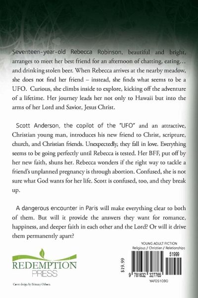 Seventeen-year-old Rebecca Robinson, beautiful and bright, arranges to meet her best friend for an afternoon of chatting, eating… and drinking stolen beer. When Rebecca arrives at the nearby meadow, she does not find her friend – instead, she finds what seems to be a UFO. Curious, she climbs inside to explore, kicking off the adventure of a lifetime. Her journey leads her not only to Hawaii and Paris but also to a new boyfriend and into the arms of her Lord and Savior, Jesus Christ. Everything goes perfectly until Rebecca is tested. Will her newfound love, and her faith in God, prevail?