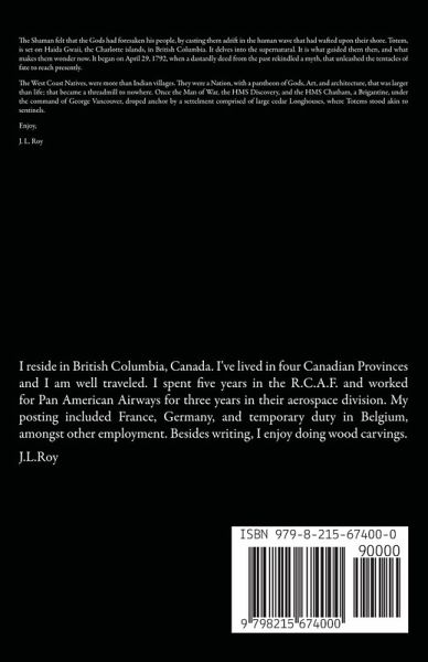 The Shaman felt that the Gods had foresaken his people, by casting them adrift in the human wave that had wafted upon their shore. Totem, is set on Haida Gwaii, the Charlotte islands, in British Columbia. It delves into the supernatural. It is what guided them then, and what makes them wonder now. It began on April 29, 1792, when a dastardly deed from the past rekindled a myth, that unleashed the tentacles of fate to reach presently. The West Coast Natives, were more than Indian villages. They were a Nation, with a pantheon of Gods, Art, and architecture, that was larger than life; that became a threadmill to nowhere. Once the Man of War, the HMS Discovery, and the HMS Chatham, a Brigantine, under the command of George Vancouver, droped anchor by a settelment comprised of large cedar Longhouses, where Totems stood akin to sentinels. Enjoy, J. L. Roy