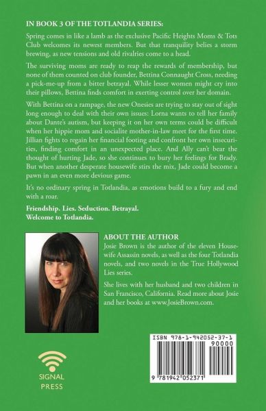 IN BOOK 3 OF THE TOTLANDIA SERIES: Spring comes in like a lamb as the exclusive Pacific Heights Moms & Tots Club welcomes its newest members. But that tranquility belies a storm brewing, as new tensions and old rivalries come to a head. The surviving moms are ready to reap the rewards of membership, but none of them counted on club founder, Bettina Connaught Cross, needing a pick-me-up from a bitter betrayal. While lesser women might cry into their pillows, Bettina finds comfort in exerting control over her domain. With Bettina on a rampage, the new Onesies are trying to stay out of sight long enough to deal with their own issues: Lorna wants to tell her family about Dante's autism, but keeping it on her own terms could be difficult when her hippie mom and socialite mother-in-law meet for the first time. Jillian fights to regain her financial footing and confront her personal insecurities, finding comfort in an unexpected place. And Ally can't bear the thought of hurting Jade, so she continues to bury her feelings for Brady. But when another desperate housewife stirs the mix, Jade could become a pawn in an even more devious game. It's no ordinary spring in Totlandia, as emotions build to a fury and end with a roar.