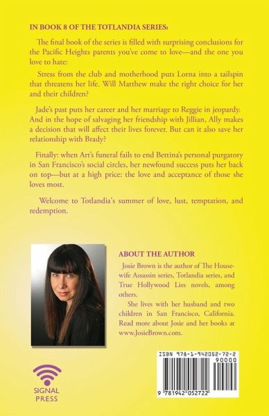 IN BOOK 8 OF THE TOTLANDIA SERIES: The final book of the series is filled with surprising conclusions for the Pacific Heights parents you've come to love-and the one you love to hate: Stress from the club and motherhood puts Lorna into a tailspin that threatens life. Will Matthew make the right choice for her and their children? Jade's past puts her career and her marriage to Reggie in jeopardy; In the hope of salvaging her friendship with Jillian, Ally makes a decision that will affect their lives forever. But can it also save her relationship with Brady? And finally: when Art's funeral fails to end Bettina's personal purgatory in San Francisco's social circles, her newfound success puts her back on top-but at a high price: the love and acceptance of those she loves most. Welcome to Totlandia's summer of love, lust, temptation, and redemption.